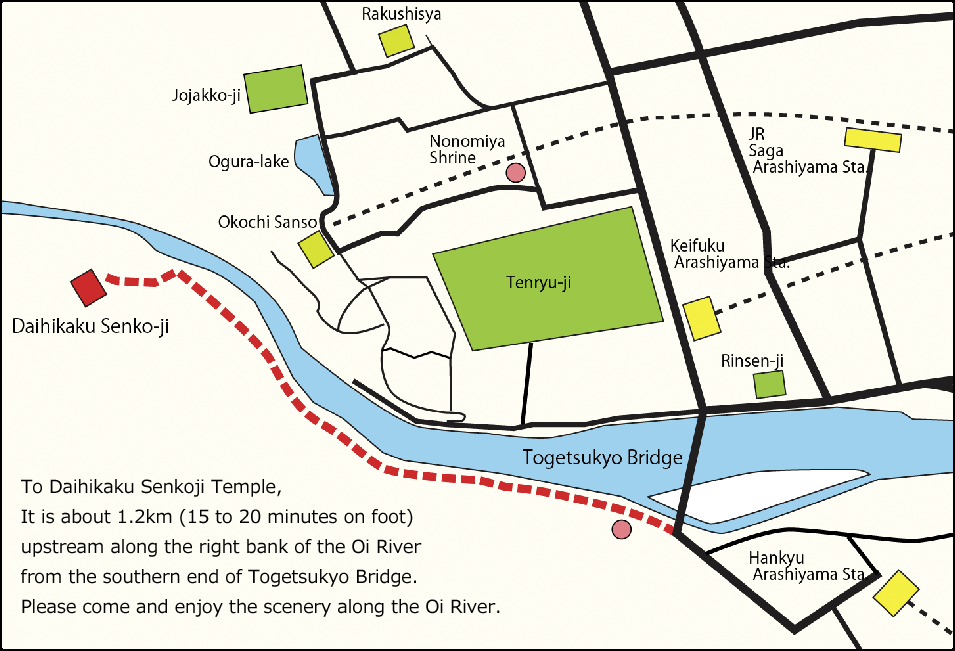 Daihikaku Senko-ji is located about 1km upstream of Togetsukyo Bridge in Arashiyama, Kyoto.